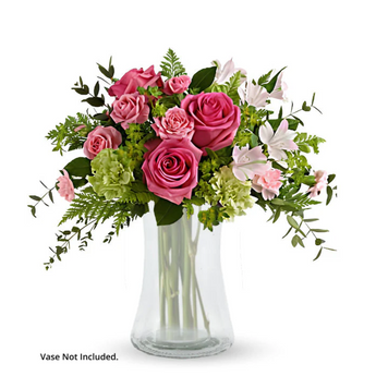 Surprise Mom with the fresh beauty of our Green Twist & Rosy Kisses bouquet—a charming arrangement where classic elegance meets a touch of the unexpected. Featuring bold roses, cheerful carnations, and soft alstroemeria, all wrapped in lush greenery, it brings a natural, garden-fresh feel to any space.