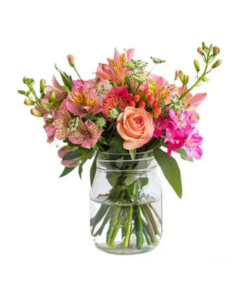 Bring a burst of colour and elegance to any space with our Sunrise Bouquet—a radiant arrangement inspired by the warmth of a new day. Featuring pink roses, delicate alstroemeria, and bright carnations, each bloom is thoughtfully arranged in a charming Mason jar for a rustic, yet refined touch.