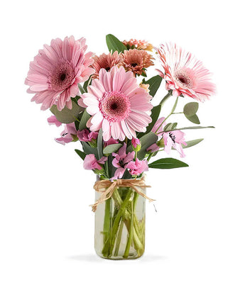 This enjoyable arrangement is bursting with vibrant pinks and purples. This was specially designed for the complimenting mixture of flowers, colours and scents. Includes vibrant gerberas, fragrant chrysanthemums, colourful alstroemerias and greens arranged in a trendy Mason Jar. Measures approximately 10" tall. Mason Jar included. Greeting Cards can be purchased at checkout.